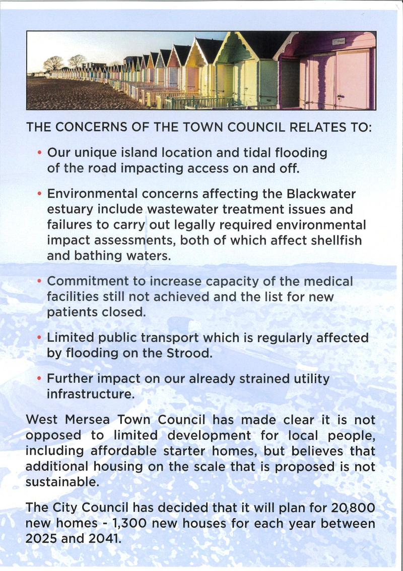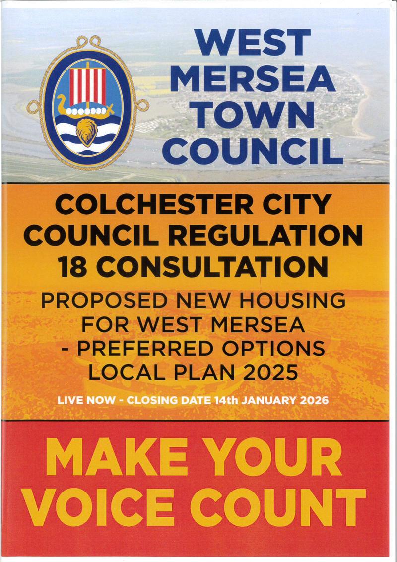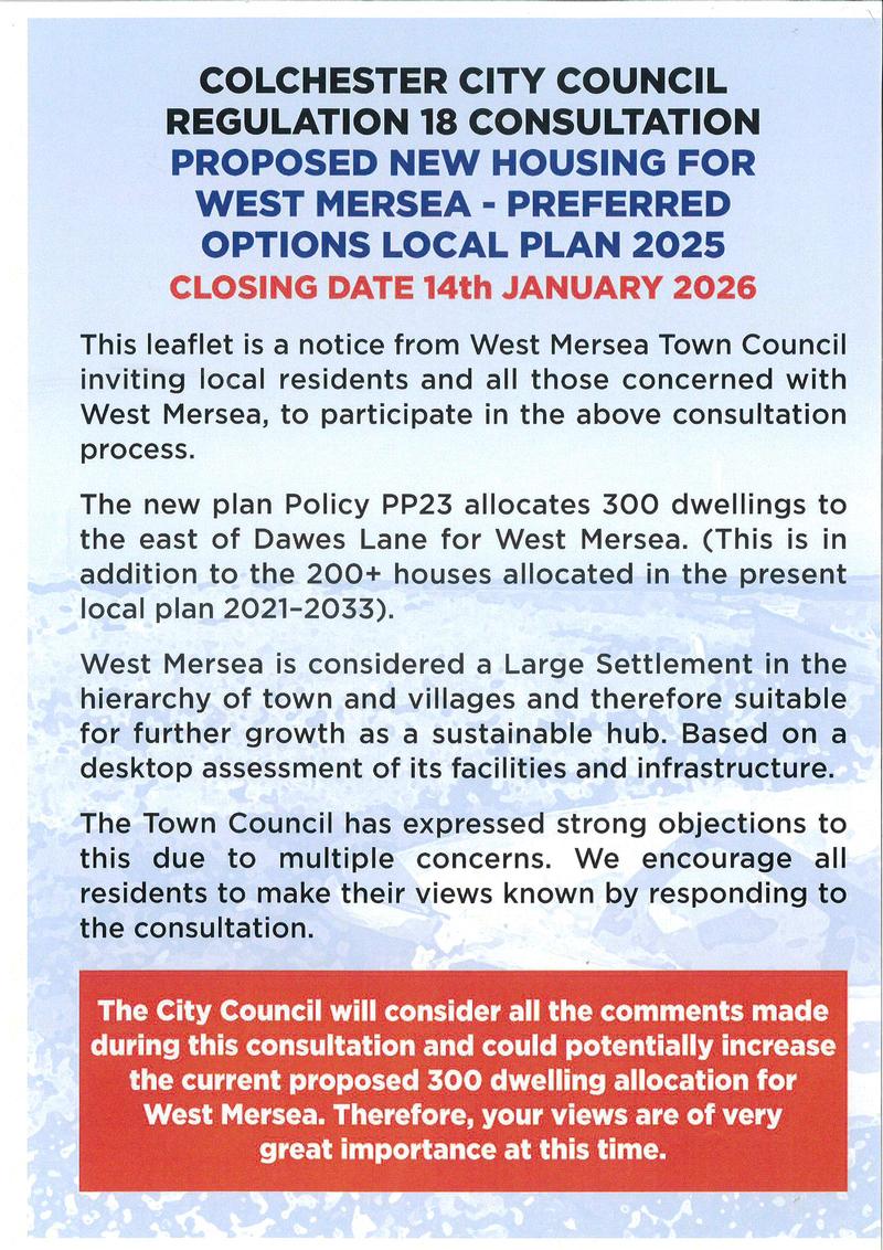 West Mersea Town Council strongly objects to the proposed Local Plan allocation of an additional 300 houses on West Mersea, in addition to the 200 already approved. To read the full letter sent to Colchester City Council and others on 07/04/25: click here
